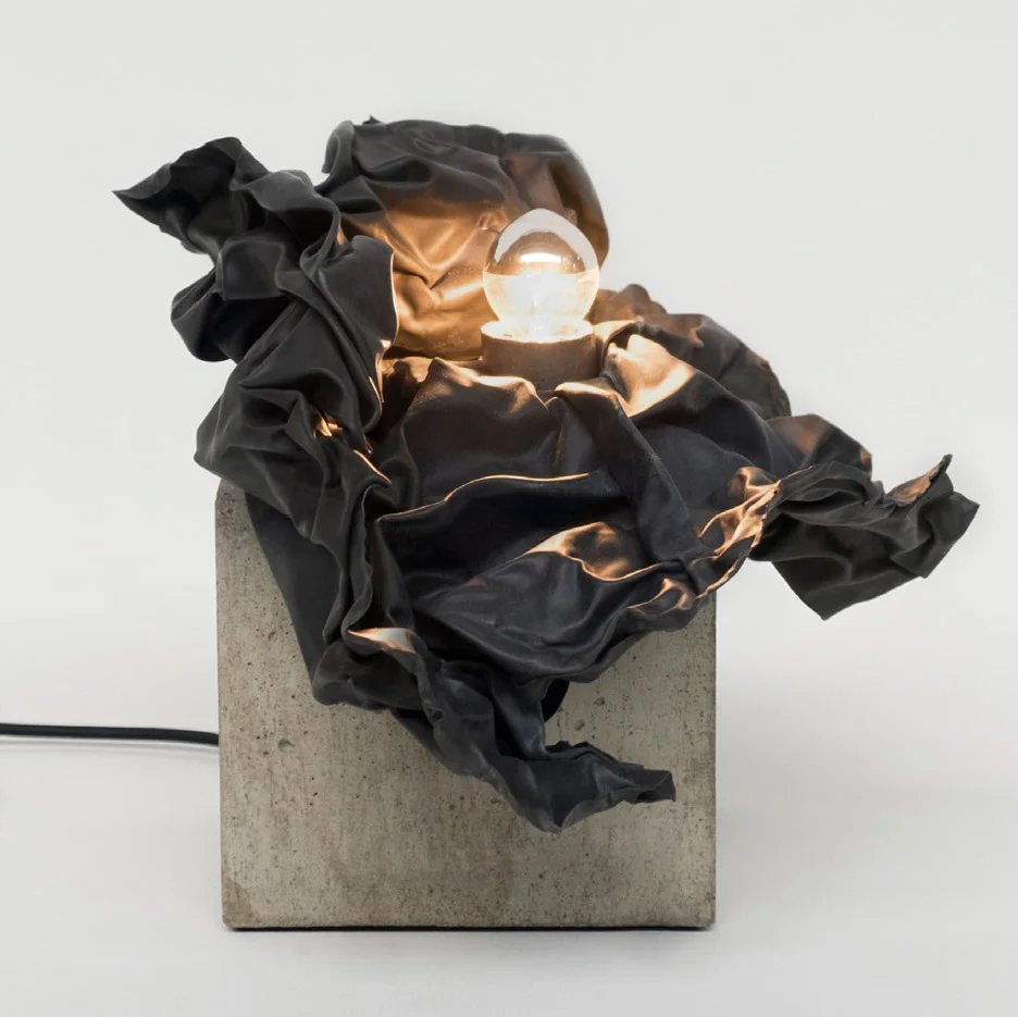 Similar operations are at play in “Indigo Bench” from 2016, a long bench that has almost half of it covered by a profusion of the upholstering material, which would obstruct with the regular use of the furniture. Here and in the “Concrete Stitches Series,” where the seating areas are made out of cement, the body and the mind are challenged in different manners. In the former case, the body is confronted by having to experience the temperature and the hardness of cement, and on the latter by having to confront the mound of wrinkled material. As for the mind, in both cases it is provoked by having to adjust to the unfamiliar and the unexpected.
